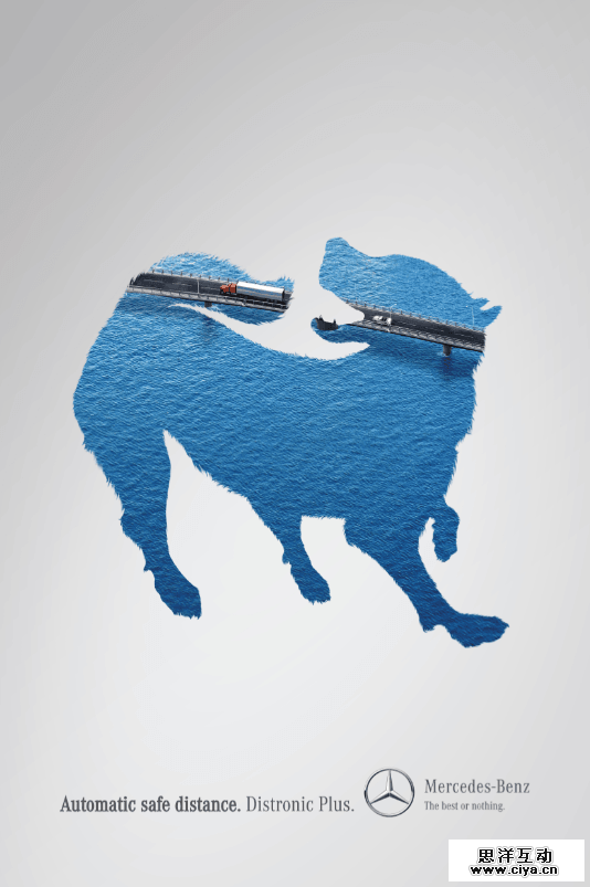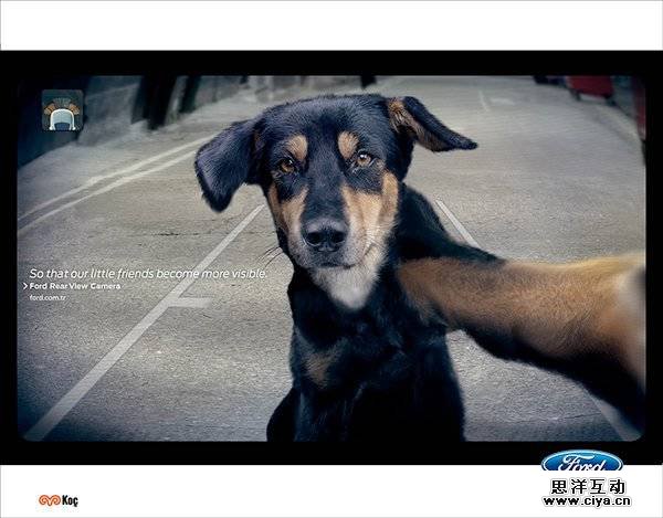 这是一只狗狗在自拍吗?当然不是。这是奥美公司为福特汽车倒车影像系统制作的平面广告。让小动物直接入境,给观者一个第一人称的直观感受,瞬间触及到人们内心深处的情感。