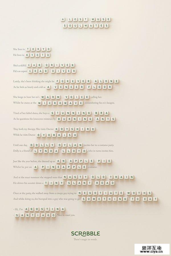 人类不能没有故事。市场营销机构 Lola Madrid 在一系列 Scrabble 的广告中,使用拼字游戏的方式写出了一个爱情故事。
