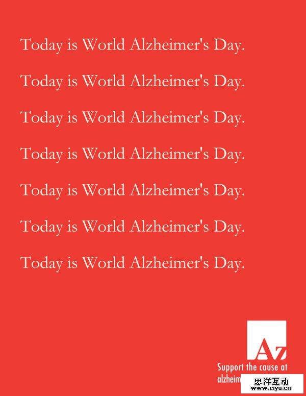 阿尔茨海默是一种使人逐渐丧失记忆的疾病,而面对阿尔茨海默氏病患者,家人总需要在每天中都不断的反复提醒他们重要的事情。这个平面广告把观者当做患者并重复提醒“今天是世界阿尔茨海默日”,希望观者引起重视,鼓励阿尔茨海默氏患者迎接挑战。