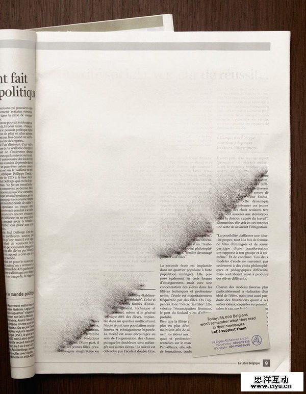 这也是一则阿尔茨海默广告,聪明的借用杂志版式并用正在消失的文字告诉读者,目前数以万计的阿尔兹海默患者和你一样爱好阅读,但他们正在一边阅读一边忘记刚刚看到的东西。
