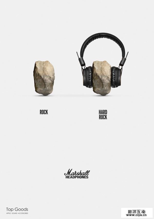 马歇尔耳机让 Rock(石头)变成 “Hard rock”(摇滚),以一种非常冷幽默的方式,用文字和大家恶搞了一下。