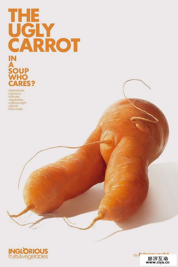 法国连锁超市 Intermarché 创造了一系列令人意外的平面广告,他们使用了很多造型古怪甚至有些少儿不宜的水果和蔬菜作为“平面模特”,以引起人们对食品浪费的关注。