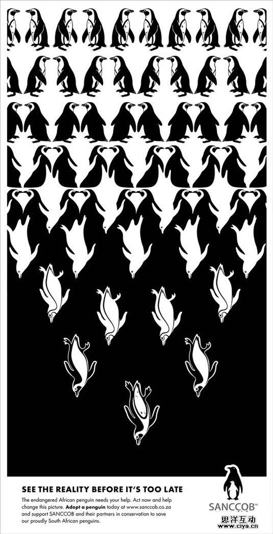 M.C.埃舍尔(不是MC天佑!)绝对是渐变构成的大师。Sanccob 的这个广告成功吸引了人们对非洲企鹅的迅速衰落的注意。