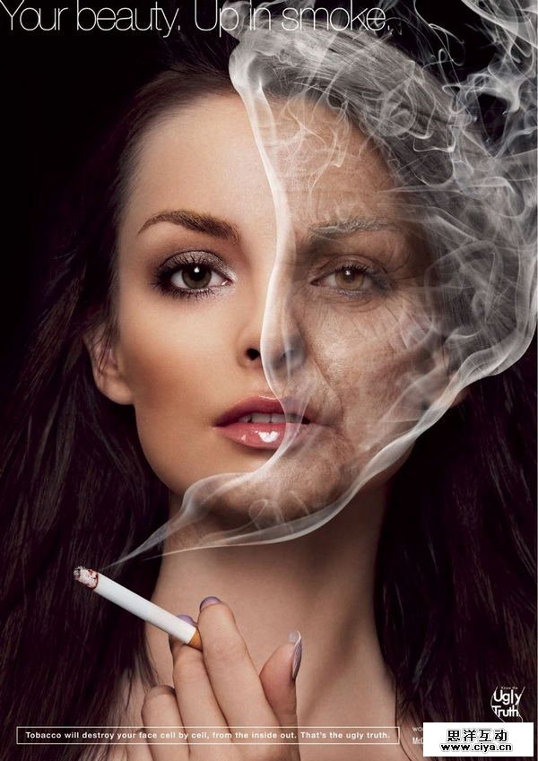 世界无烟日广告,将吸烟前后的两张脸合成到一起形成了鲜明的对比。
