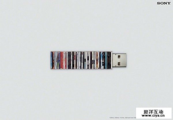 索尼的这个广告中,通过 CD 堆叠而成的 U 盘形象让我们看到了新技术是怎样淘汰掉过时的技术的。