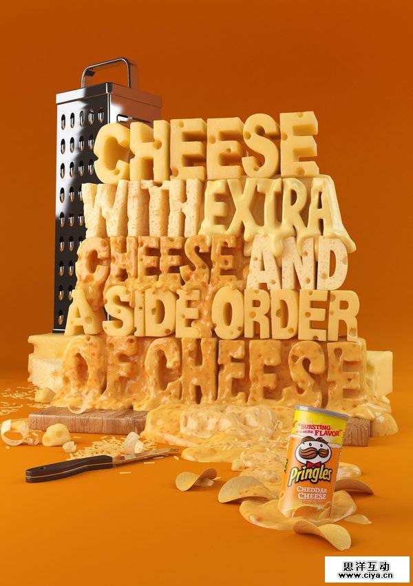 这个秘笈很适用于食品哦!一堆诱人的奶酪放在那里,就算再饱的肚子也会瞬间饿瘪掉。