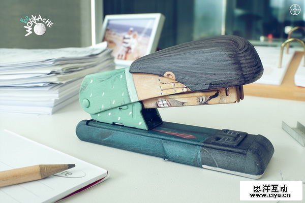 BAYER 拜耳阿司匹林止痛药系列创意广告。订书器、锤子、菜刀被画上人物的肖像,每当它们被迫工作都会很“头痛”,作为使用者我们能够一下子建立通感,是啊按着订书器的头一下一下的磕着真的很痛,而且自己手上的工作想想就很头痛。
