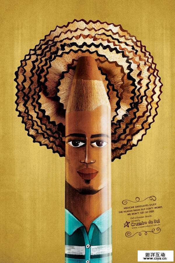 Juliano de Almeida 的这一系列广告使用有趣的创意来宣传 Cruzeiro do Sol 大学。铅笔上的面孔、服饰和首饰以及铅笔屑做的头发看起来很好玩。