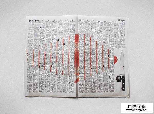 在奥美哥伦比亚分公司为 Carulla 刀具打造的一系列广告创意中,非常机智的利用了报纸的栏间距,呈现出鱼和蔬菜被刀具切割出来的样子。