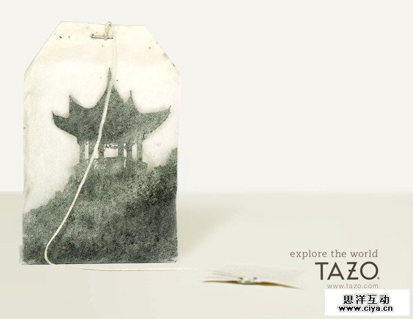 泰舒茶(Tazo)广告中,用茶包中的茶叶构建出了一个富有地方特色建筑,为消费者讲述了一个关于茶叶起源的故事。