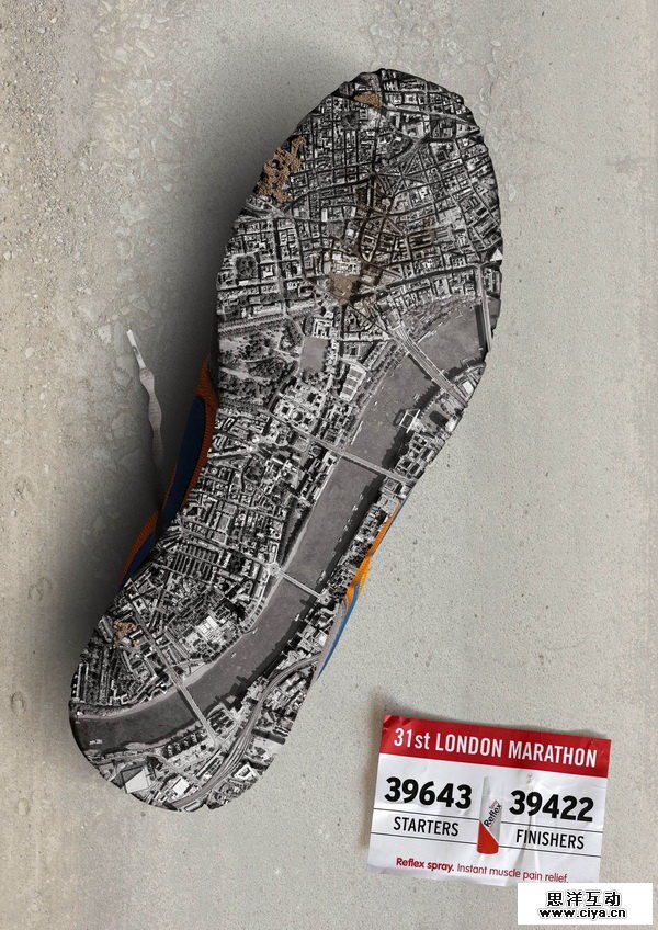 Reflex Spray 喷雾,能够及时缓解肌肉疼痛。 广告以破旧的鞋底直接作为传达创意的媒介,给人一种出乎意料又仿佛在情理之中的感觉!旁边那张参赛凭证一样的小纸条上的文字暗示人们:“这些都是得益于 Reflex Spray 喷雾剂的帮助!”。
