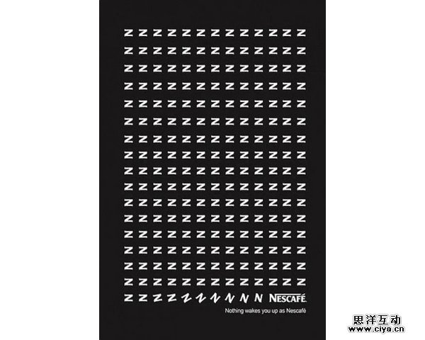 越是简洁的创意越有力量。雀巢这个广告融合了渐变和特意两种构成形式,从代表睡觉的字母 z 到醒来的字母 n 再到雀巢的 logo,只有雀巢咖啡才能叫醒你。