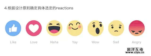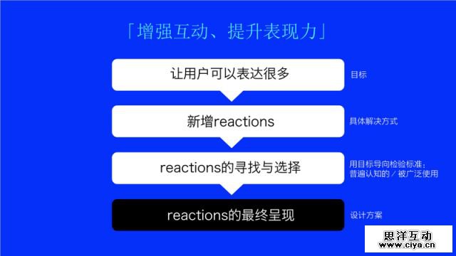 他是这么阐述LIKE的设计方案的:这个设计的目的是优化LIKE的按钮,增强用户的互动意愿,以及提升LIKE的表现力。而他做的第一件事情就是理解什么叫增强互动,什么叫表现力,背后的产品目标是什么?是用户可以更多的表达。然后开始找如何让这个目标具体化。接下来寻找什么是被普通认知和广泛接受的reactions。