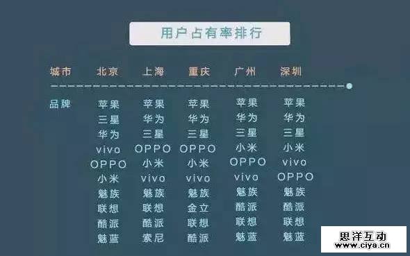iPhone的庞大用户量和极高的用户忠诚度是它霸气侧漏的筹码。 新浪科技去年出炉了一份国内五大一线城市第三季度的手机数据分析报告,苹果在北、上、广、深,以及新一线城市重庆中均稳居第一。