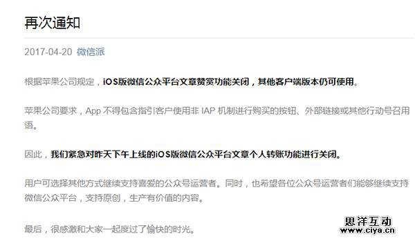 4月19日下午,腾讯微信团队突然发布公告:受苹果公司新规定影响,4月19日17时起,苹果iOS版微信公众平台赞赏功能将被关闭。