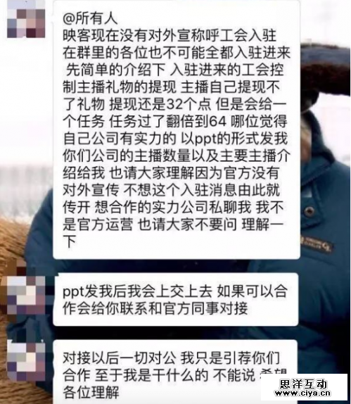 虽然映客官方没有证实,但该工作人员肯定表示,“我不是映客官方的人,但没有我搭桥你们(公会)也入驻不了。”同时他也提到:“我只是作为中间人引荐有实力的公会给平台,你们的合作、签约都是和映客官方的。”