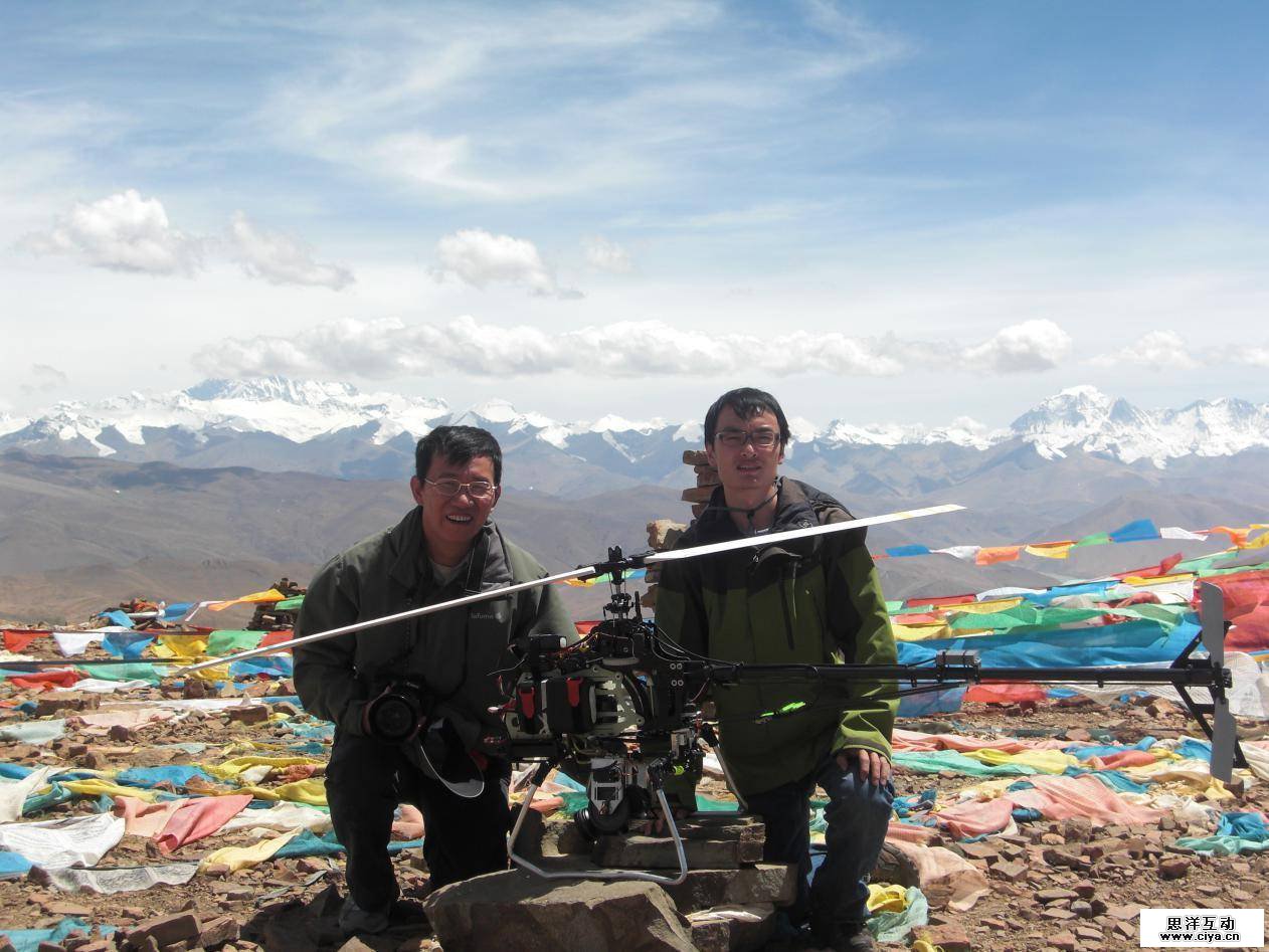 2008 年,李泽湘(左)和汪滔抵达西藏,完成世界首次无人机珠峰地区飞行测试