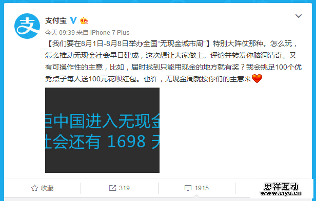目前支付宝已经跟杭州、武汉、天津、福州以及贵阳等多个城市合作,成立了“无现金城市”,在八月份,支付宝将继续发力举办全国“无现金城市周”推动无现金社会早日建成。