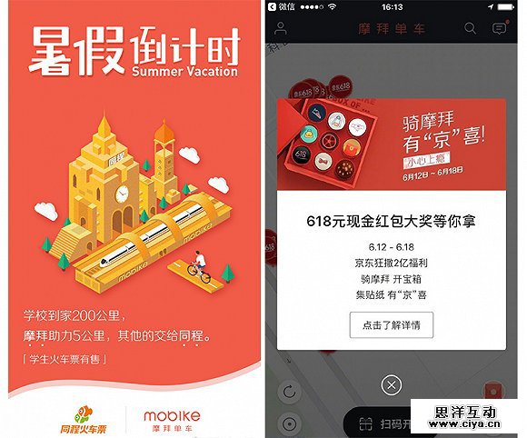 公司内部没有资源可共用时,可以寻找外部资源,摩拜单车在做活动的时候,就与很多公司合作,比如同程火车票APP、京东APP,通过与知名公司合作,不仅达到了资源共享,还能提高活动的参与率,将活动的效果最大化。