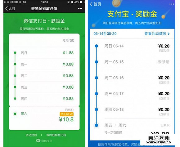 微信钱包推出了鼓励金活动,线下使用微信支付可以获得鼓励金,每周四累计的鼓励金可点击翻倍,以此来促进用户使用。后来支付宝也推出了鼓励金活动,使用支付宝支付,就可以获得鼓励金,而且每一笔都可以点击翻倍。在支付宝推出鼓励金之后,微信钱包对自己的鼓励金活动做了个更改,必须在两分钟内点击才可领取鼓励金,逾时失效,增强用户的感知。