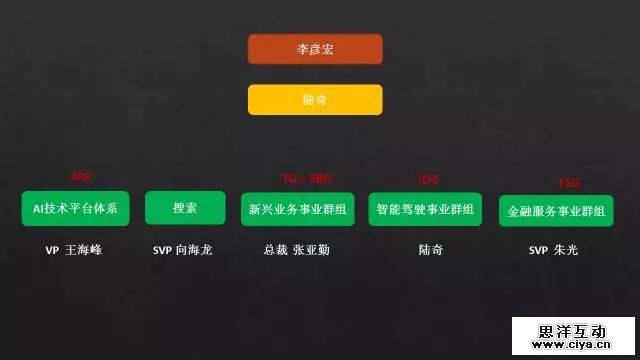 陆奇的五大业务体系中,除了AI技术平台(AIG)外,还有搜索、新兴业务事业群组、IDG(智能驾驶事业群组)和FSG(金融服务事业群组)。