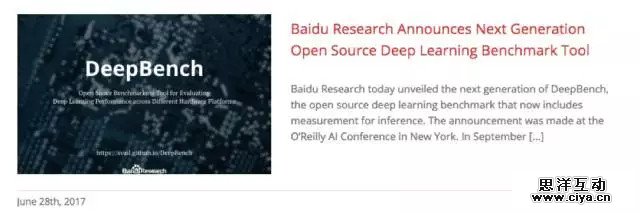 正如他们自我介绍里所说,百度在硅谷的 AI Lab 专注于深度学习技术与国内较为知名的深度学习实验室(IDL)功能类似。百度硅谷 AI Lab 在学术研究上较为活跃,经常在官方博客上介绍最新研究,比如最新的深度学习基准工具 DeepBench。DeepBench 是一种深度学习基准工具,用来评估深度神经网络训练中的基础操作的表现,现在已经开源。