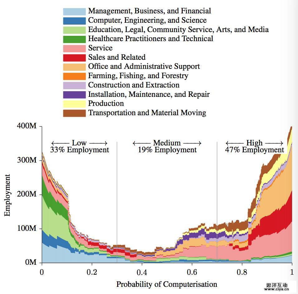 英国剑桥大学的两位学者 Carl Benedikt Frey和Michael Osborne早在2013年就曾精确测算出,未来十年到二十年,在美国的702个工作种类中,大约有47%的岗位危在旦夕,包括当下交通、物流的从业大军、制造业人员以及臃肿的办公室行政岗位,还有保险销售、房产中介都将大批消失,被计算机所替代。