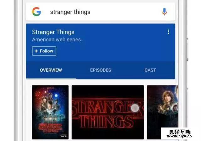 而Google不仅会根据用户的搜索记录提供相应的资讯,在用户进行搜索时,Google还会在搜索结果中会提示相应可供关注的主题,例如电视剧《Stranger Things》,Google会把这部电视剧的新进展、新消息推送给你。可以说GoogleFeed真正做到了将推荐和搜索有机的结合在了一起。