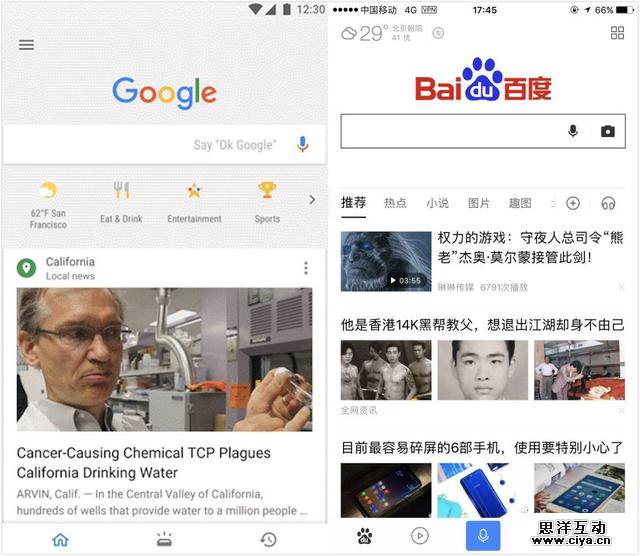 几乎在同一时刻,百度和Google两大搜索巨头都对他们的搜索App进行了改版。手机百度9. 0 将导航页和底部菜单都进行了彻底调整,让整个手机百度基本变成了一个新闻客户端。而Google搜索App则在经典的搜索框下面同样也加了一个新闻信息流的功能Feed。