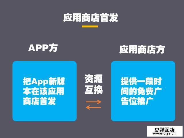 比如应用商店首发,是一种很常见的资源互换方式,通过选择在某个应用商店首发,且在应用启动页标注首发于某应用商店,能够获得该应用商店一段时间的免费广告位。