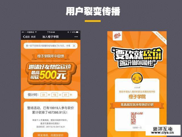 和前面口碑传播不同之处在于,这个用户传播机制利用的更多是,用户对利益奖赏的驱动,比如砍价、奖品、冲榜等。