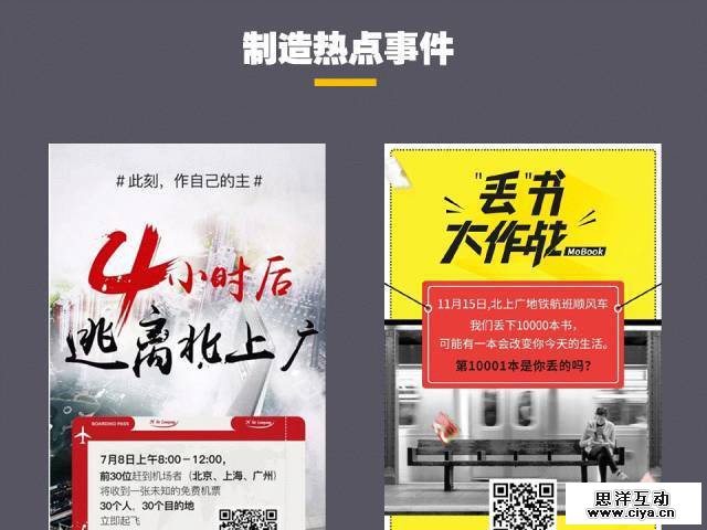 新世相策划的逃离北上广和丢书大作战都是一个非常成功的热点事件,不仅在很多人的朋友圈里刷屏,还引发了很多媒体、公众号争相报道,带来了很多的关注和传播。