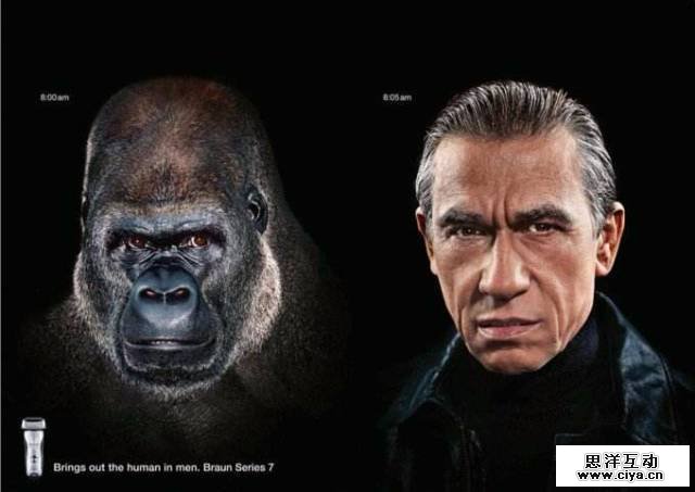 博朗剃须刀增加拍了一组猩猩与人放在一起对比的照片,在有一定相似性的同时,更有很强的对比效应。用这种夸张的艺术手法,将剃须刀的效果淋漓尽致地表现了出来。
