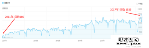从 2011 年到现在,数据分析的百度指数持续上涨。2014-2015 是重要节点,原因是从 09 年移动互联网开始以来,随着智能手机第一波换机潮和第二波换机潮,带动移动互联网发展。大量的企业入场,让增长的成本变得非常高,于是通过数据分析的精细化运营,变得越来越重要。