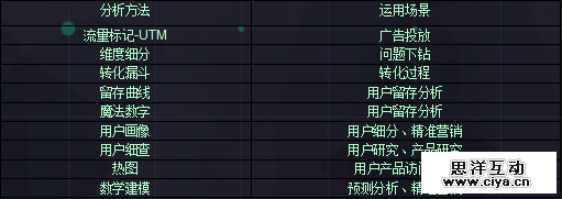 简单列了几个分析方法和应用场景。第一是流向标记,这个大多数用在广告投放,就是流量标记。只有流量标记才能清楚的知道哪个投放标准和渠道是优质的,哪个渠道的用户是我们想要的?下一步就可以加大预算或者提高。