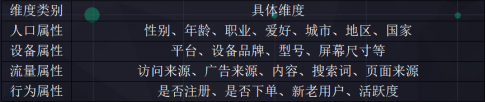 维度是用来对指标进行细分的属性,比如广告来源、浏览器类型、访问地区等等。
