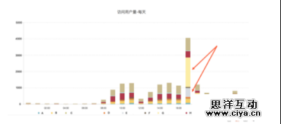 然后,我们从落地页面维度拆解,就可以发现流量主要落地页是 E 和 G 两个页面,最后我们就可以得出结论:下午 5 点从微信突然涌进大量流量到 E 和 G 页面,与内容的同学同步了一下,是他们在微信上推了一个落地到 E 和 G 页面的活动。