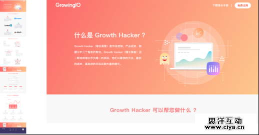 以Growinglo为例,这是我常用的一个数据分析统计工具。在国外用的比较多,但是价格不菲。大家看一下这个页面,其实是一个落地页面,我们分用户触达、用户号召、用户展示,右边是一个大图,左边切了几个小图。