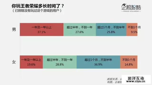1.女性玩家在后期加入游戏的占比更高:51.7%的女性玩家玩王者荣耀不到半年,男性玩家是35.3%。