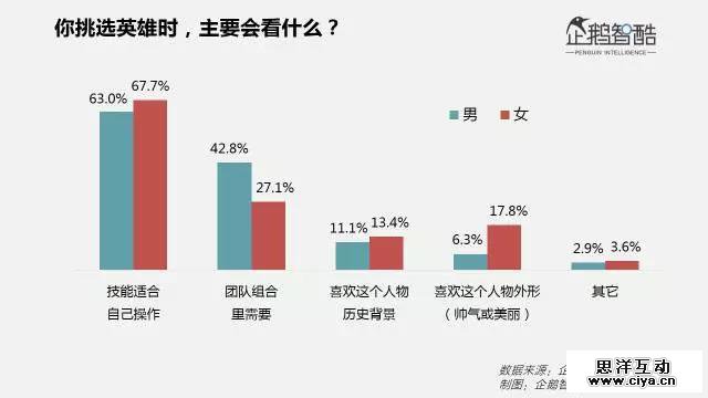 4.女性玩家挑选英雄时看外形的占比(17.8%)高于男性(6.3%),考虑团队组合需要的占比(27.1%)则低于男性(42.8%)。