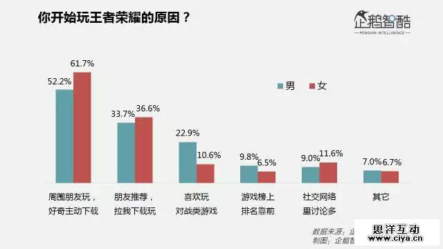 因周围朋友玩而引发了自己的好奇,这是大多数玩家开始玩王者荣耀的原因。这一点女性玩家比男性表现得更为明显,前者的占比为61.7%,后者为52.2%。朋友推荐拉我玩和社交网络里讨论多的比率里,女性表现也略高于男性。
