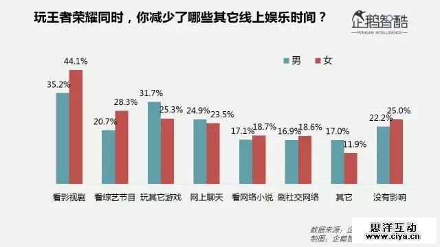 王者荣耀对于影视娱乐的替代性最强,超过三分之一的男性玩家牺牲了看剧时间,而女性玩家的影视娱乐减少占比更是接近半数。在影视之后,女性玩家牺牲第二多的娱乐时间是看综艺节目,而男性玩家则是“玩其他游戏”。