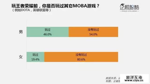 玩王者荣耀的女性玩家里,80.6%此前没有玩过DOTA或英雄联盟这类MOBA游戏。男性玩家里有54%没有玩过。