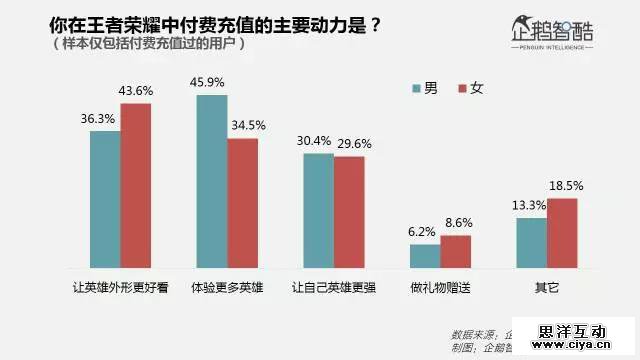 对于在游戏中付费充值过的用户,43.6%的女性玩家对英雄外形提升的需求更高,而男性付费充值的第一动力是为体验更多的英雄。