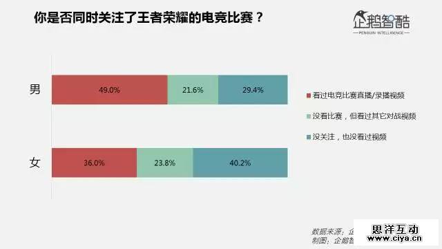 9.王者荣耀带动电竞比赛观看,有36%的女性玩家也加入了观看队伍,男性玩家里的观看占比约一半。