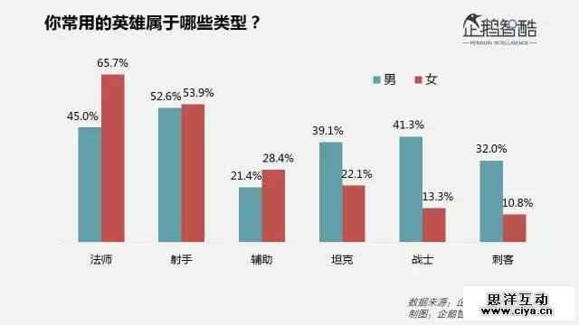 但从团队组合的需要方面来考虑选英雄方面,女性玩家里的占比则低于男性玩家,前者的占比为27.1%,后者则达到了42.8%。