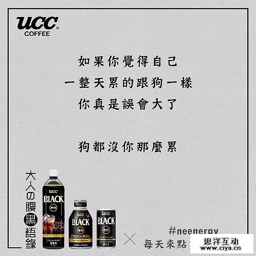 2017年丧文化当道,不少品牌借助这个热点发力。无糖黑咖啡UCC BLACK就是其中的一个,台湾的负能量UCC咖啡针对那些忙碌的都市“大人们”,推出了负能量咖啡瓶,并高呼着“每天来点负能量”,同时还举办了一场腹黑语录分享大赛。最终负能量咖啡这一借势营销击中了80后群体嗨点,与80后群体进行了一次丧文化交流,令他们对UCC咖啡这一品牌有了认知。