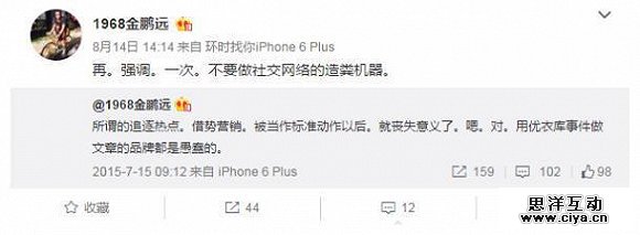 杜蕾斯创意的主操刀人金鹏远对借势品牌表明了自己的态度,“热点被当成了标准动作,丧失了意义,品牌对热点不做辨别,盲目追赶是一种愚蠢的行为”。在马蓉王宝强离婚事件中也有品牌做了借势营销,金鹏远再一次在微博发声,呼吁不做社交网络遭粪机器。