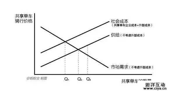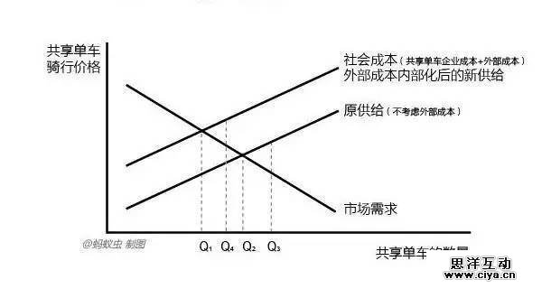 上图中的Q1是公共资源所能承担的最优数量,此时可兼顾效率和公平。而Q2则是共享单车目前成本状况下的供给量。很显然,Q2要远大于Q1,由于共享单车的非理性投放行为,实际的投放量甚至是更右侧的Q3。Q3和Q1之间的差值,就是超过最优数量的共享单车投放量,也就是各大城市的新困扰所在。