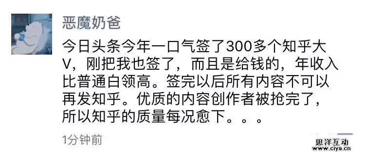 昨日下午,一张恶魔奶爸的朋友圈截图开始大量在圈内流传,提及头条正在大面积以签约付费且排它的形式“挖”走知乎的站内大V。